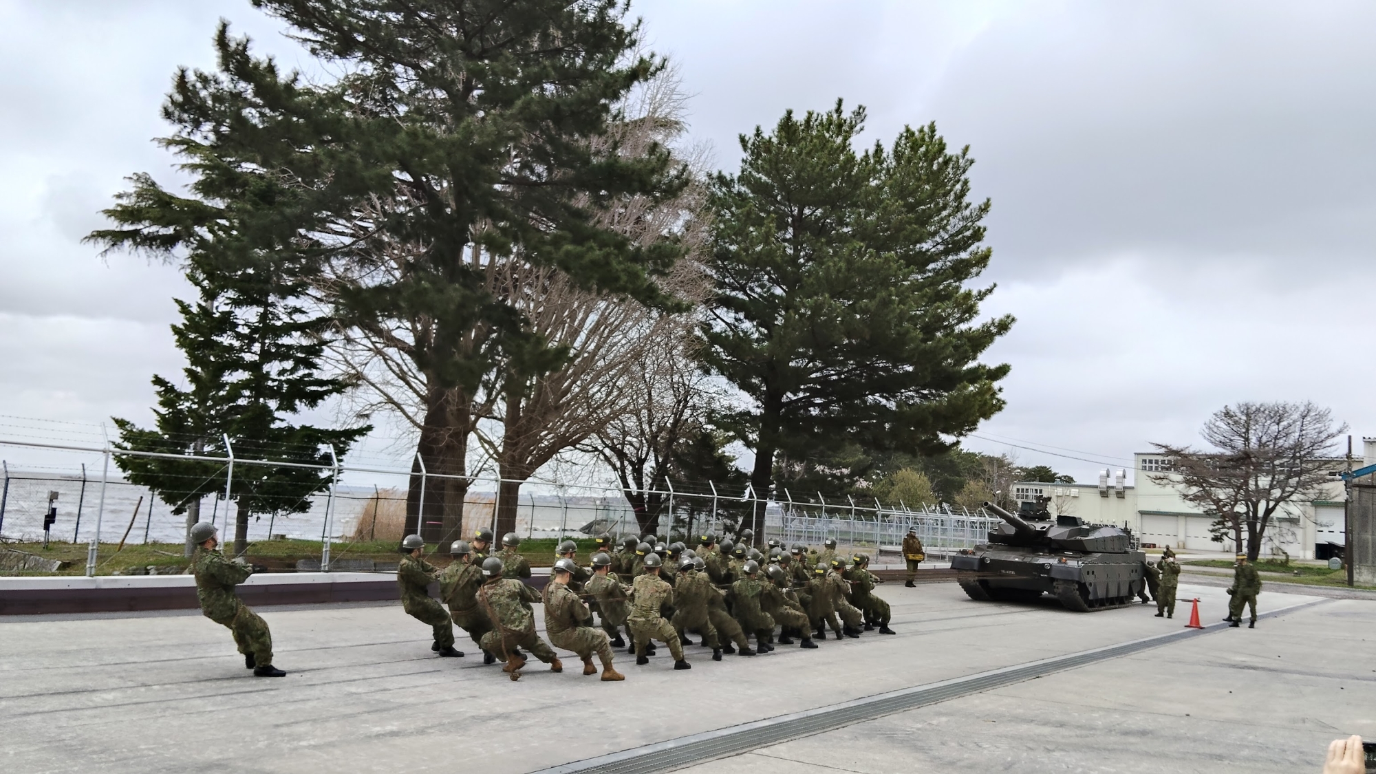 昇任行事は午前9時30分から、生徒課程同期47名による駆足行進(約3km)から始まり、私たちは彼らをゴールで拍手をもって出迎え、次に全員による10式戦車(約44トン)の約30mに及ぶ綱引き牽引を実施、引き続き整備工場に移動し、47名それぞれが昇任に当たり佐藤武器科部長の前で決意表明を実施されました。