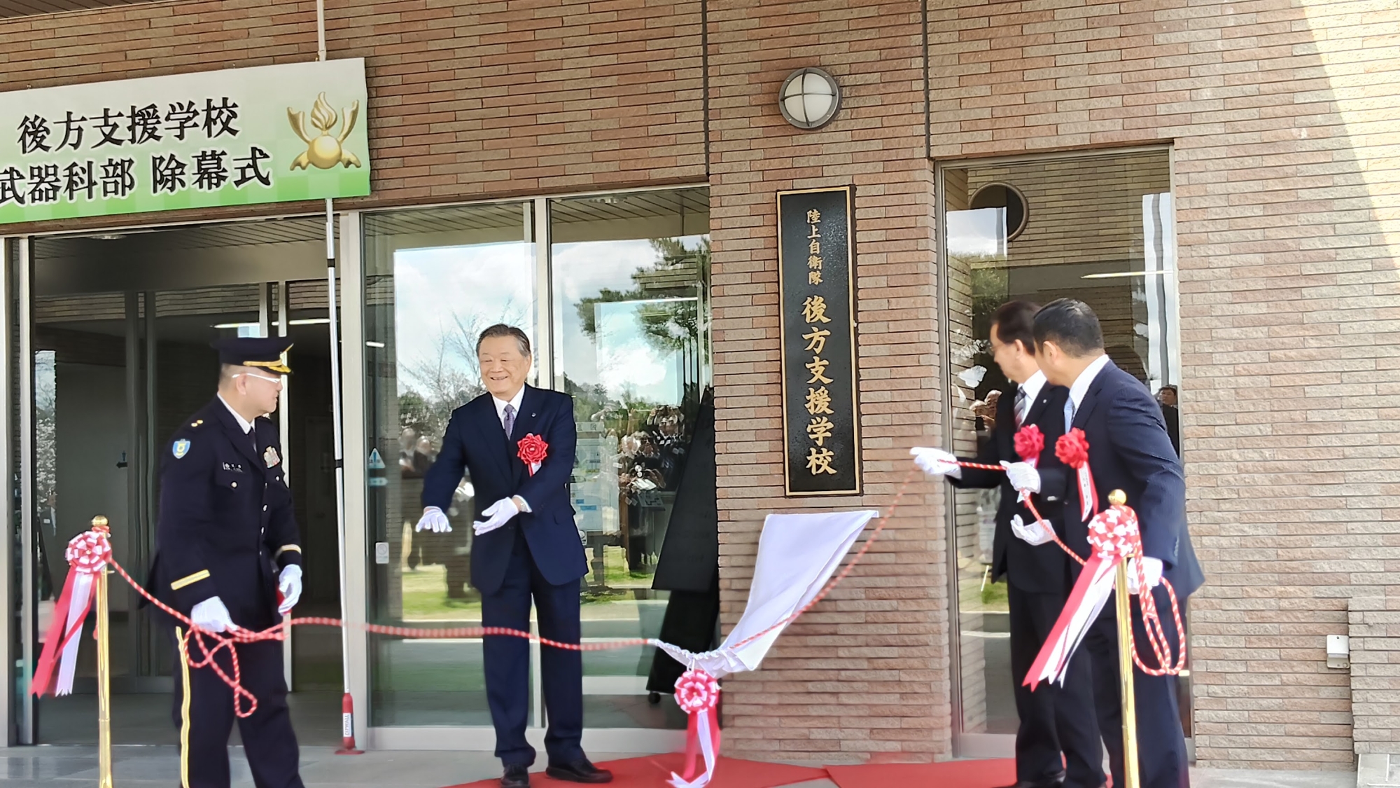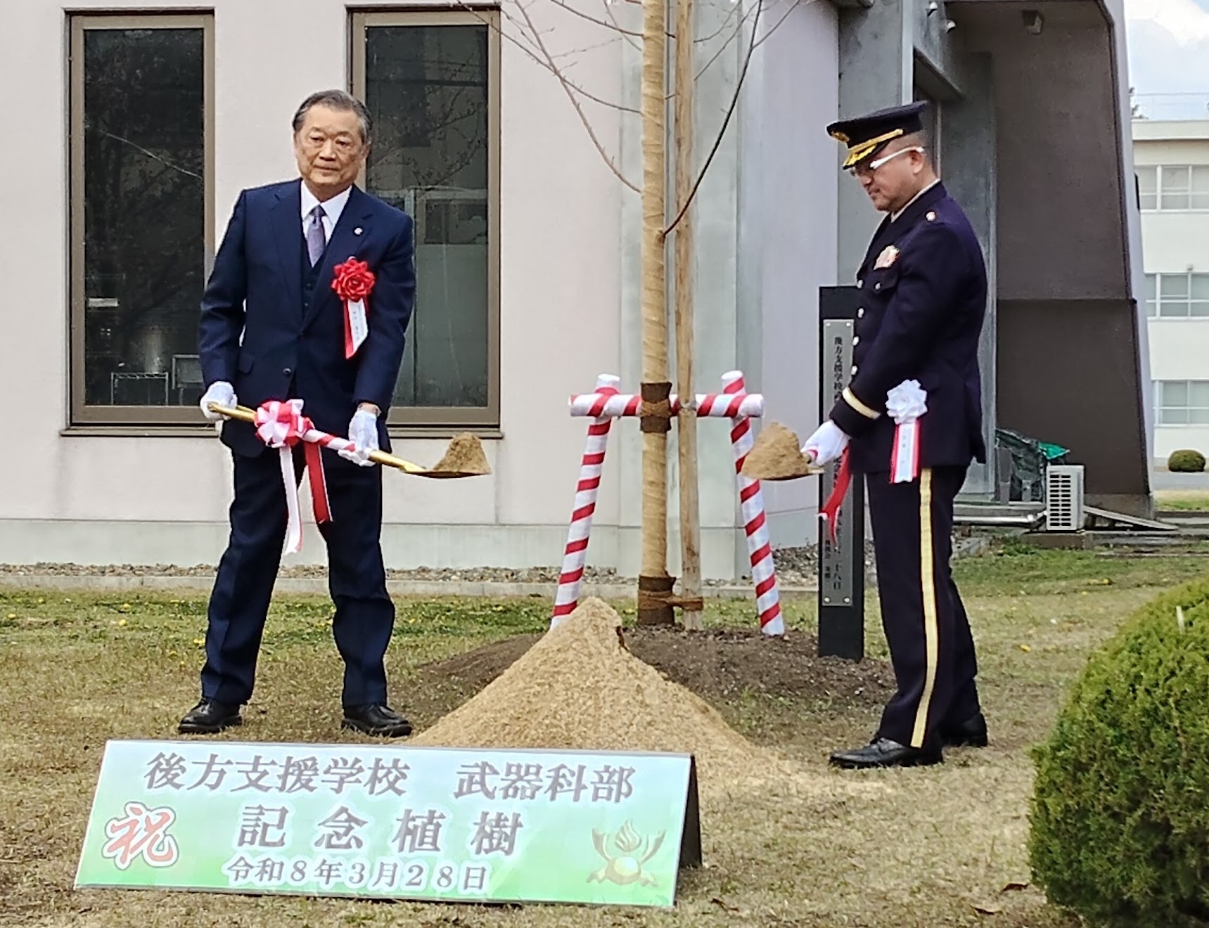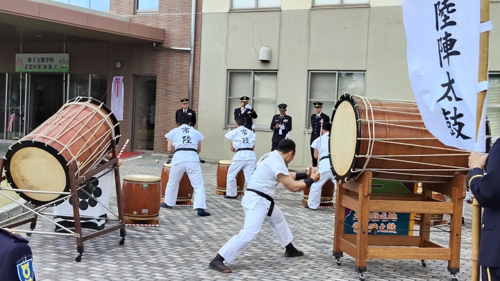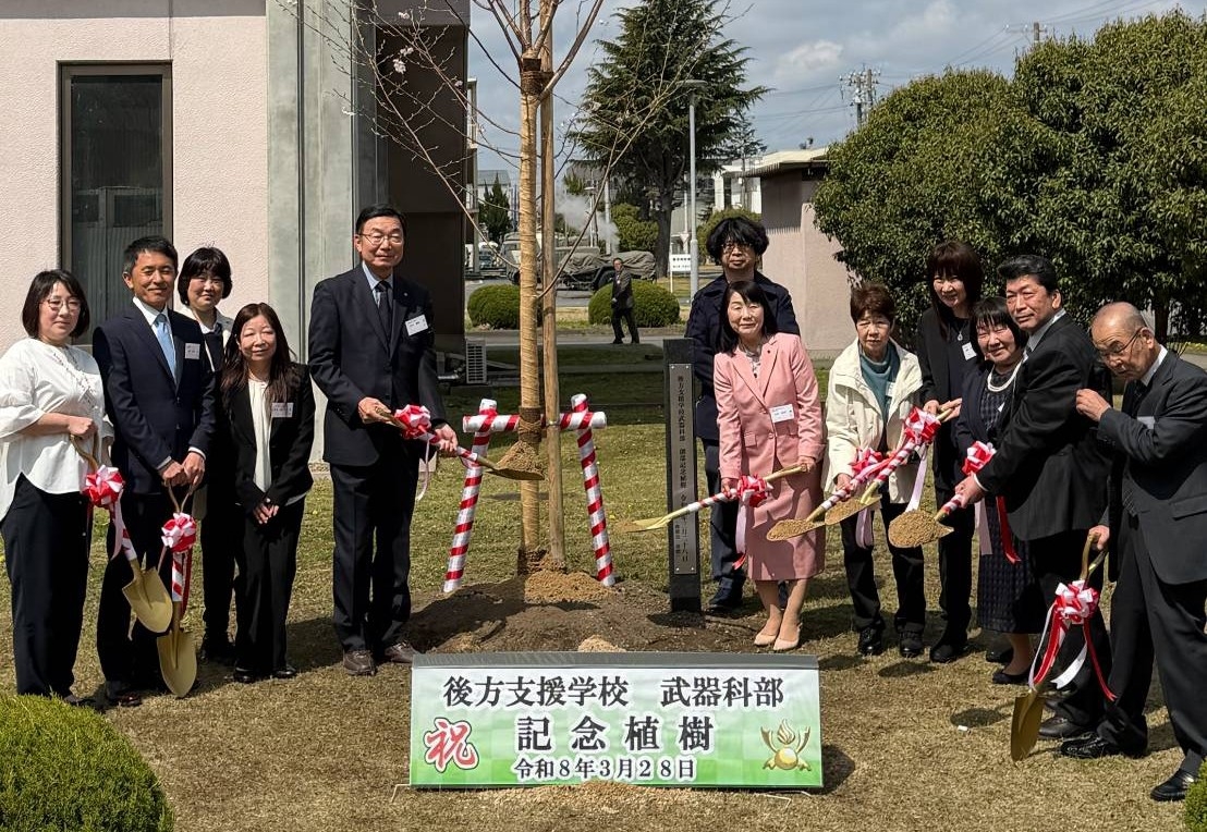この日は、教導隊の常陸陣太鼓で祝賀演奏を行い、次に武器科部の看板の除幕式、記念植樹、引き続き祝賀を兼ねた観桜会食が実施されました。