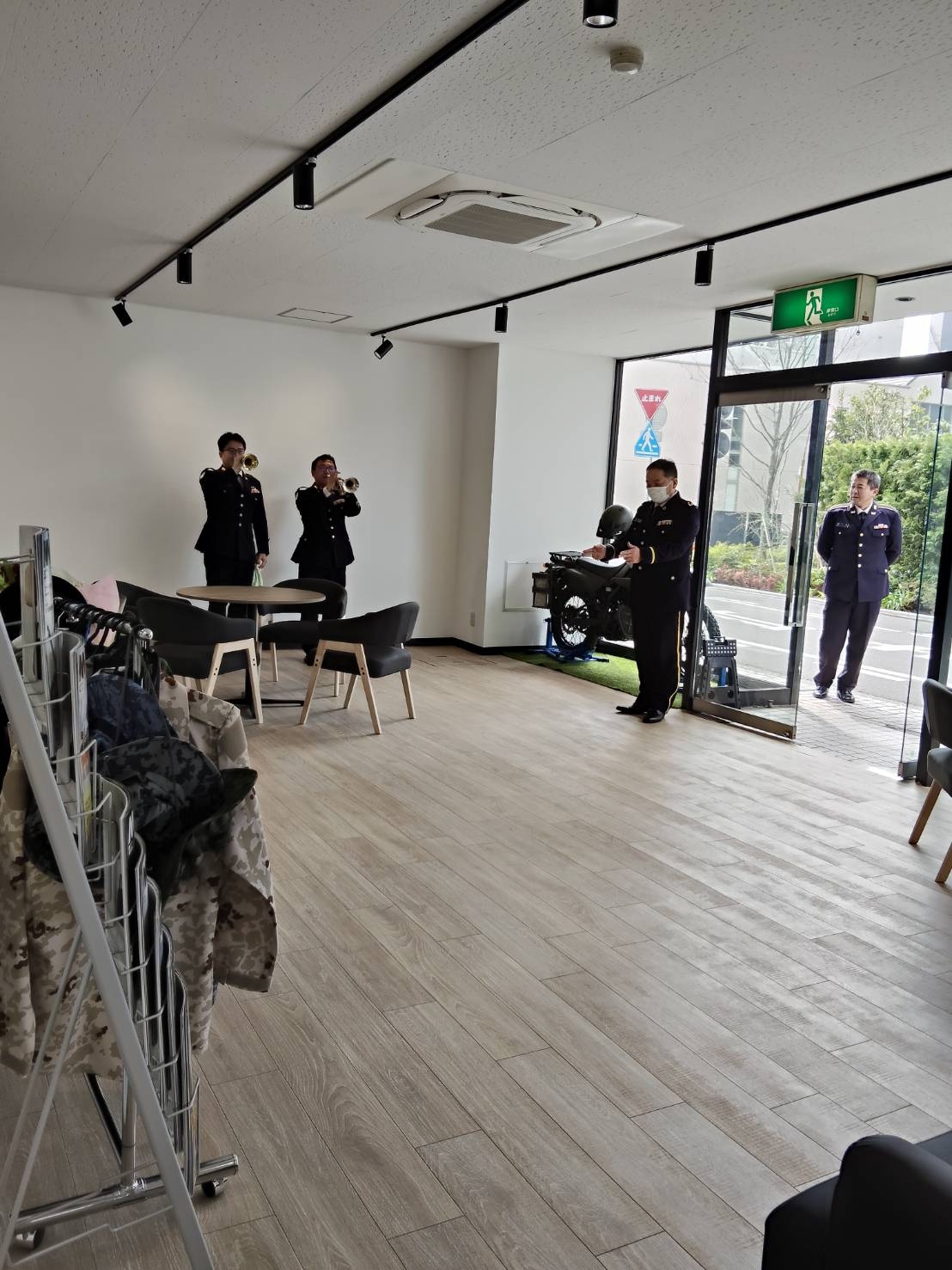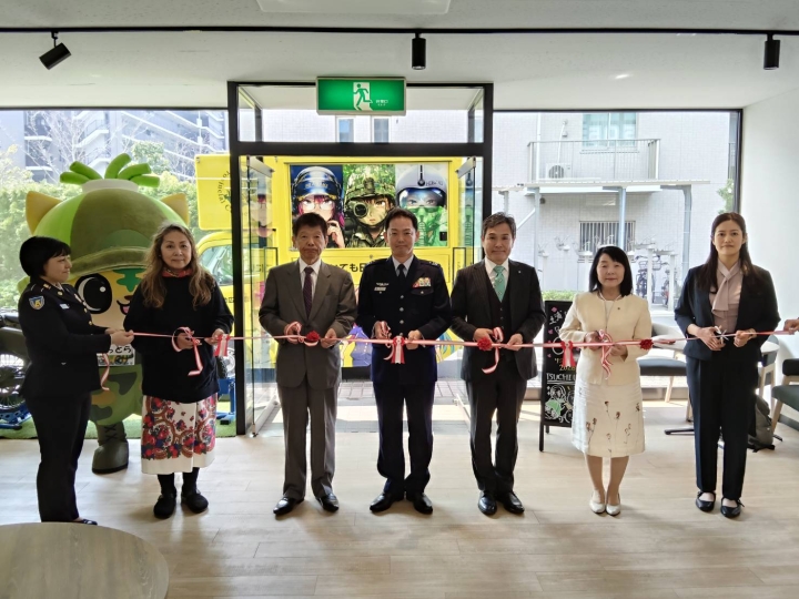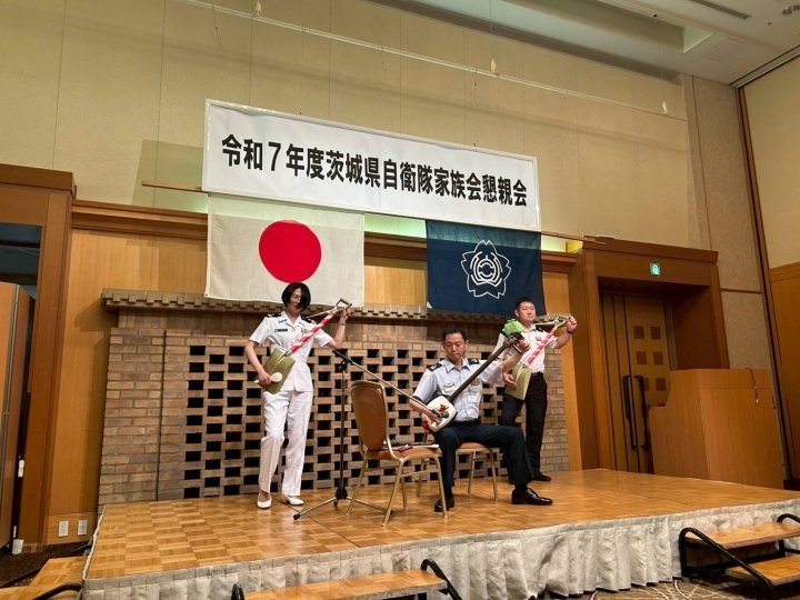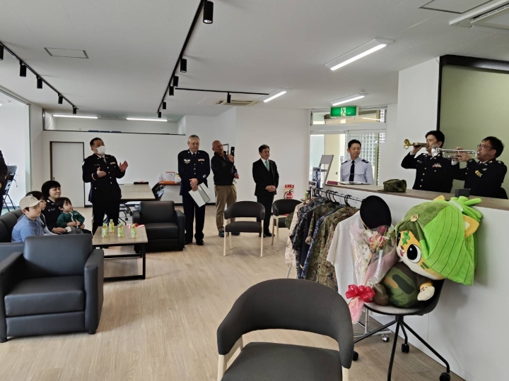 内容は、先ずラッパによるセレモニーのオープン演奏を行い、引き続きテープカット、地本長による三味線演奏と続き、隊員のご家族も参加されました。