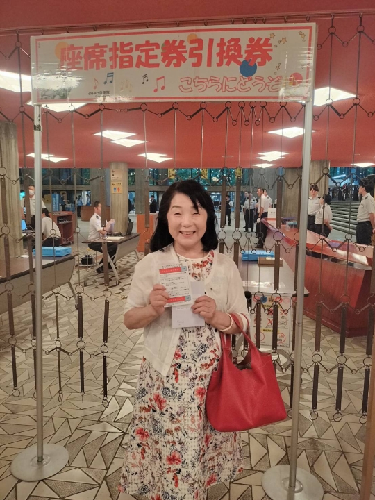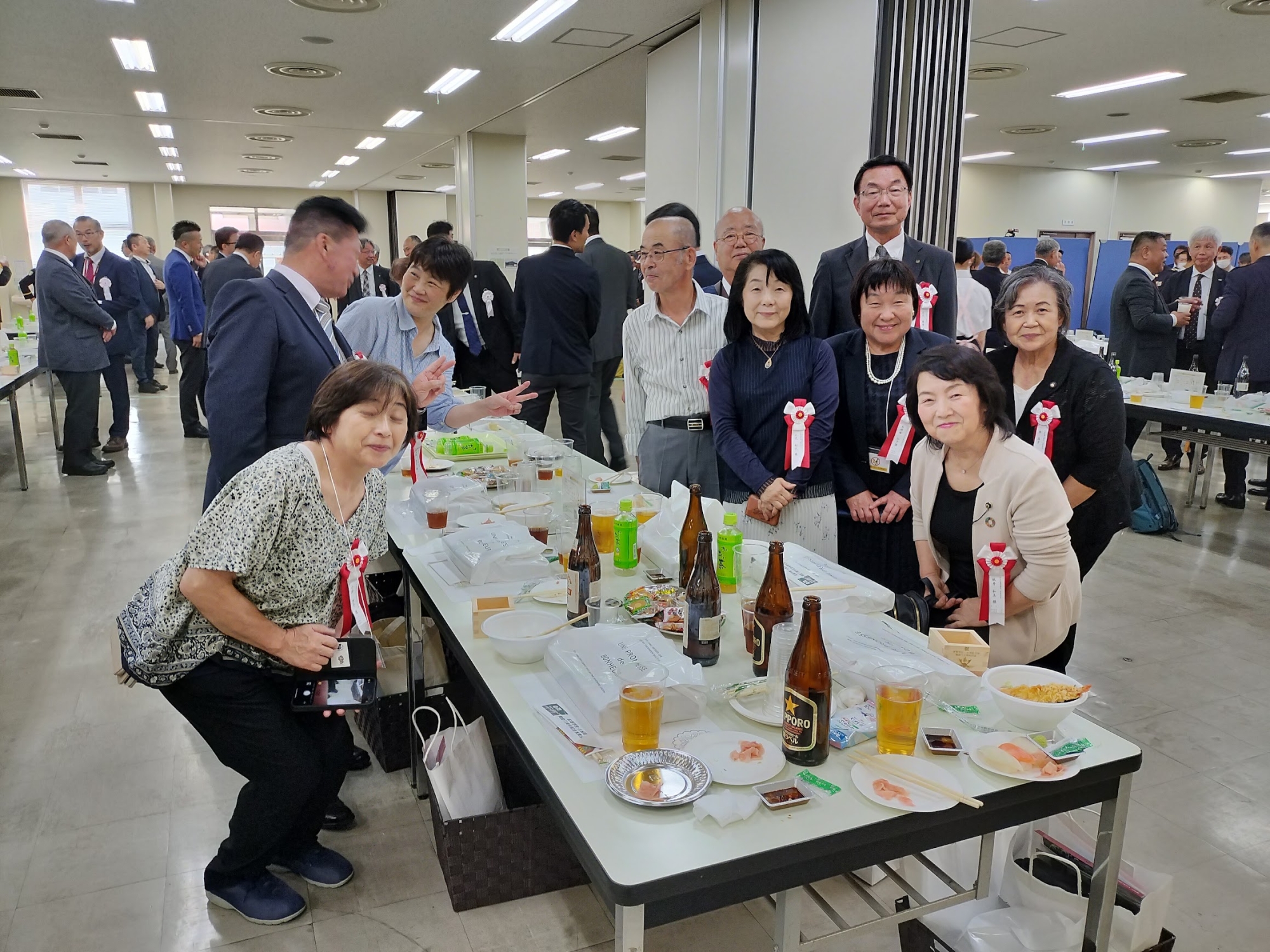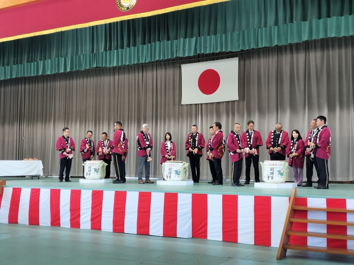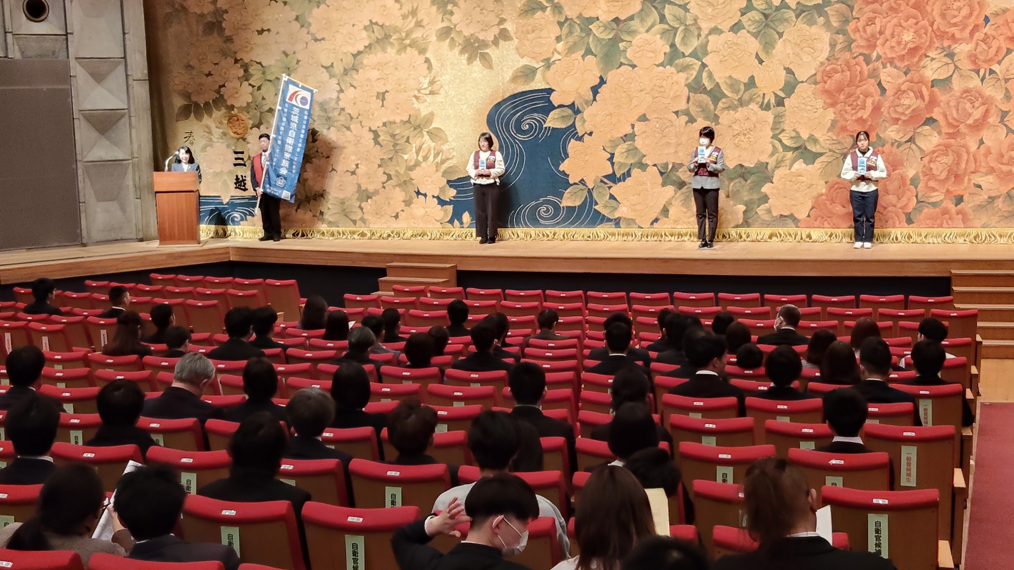 入会説明は、ステージ上に正代県会長、補佐役として小針さん(旗持)のほか大森さん、関根さん、豊島さんの3名が上がりました。会長の説明に合わせてこの3名がパンフレットを表示し、他の会員は2階前列の椅子席にて拍手と祝言「おめでとうございます。」の発声をタイミングよく実施し、場を盛り上げました。