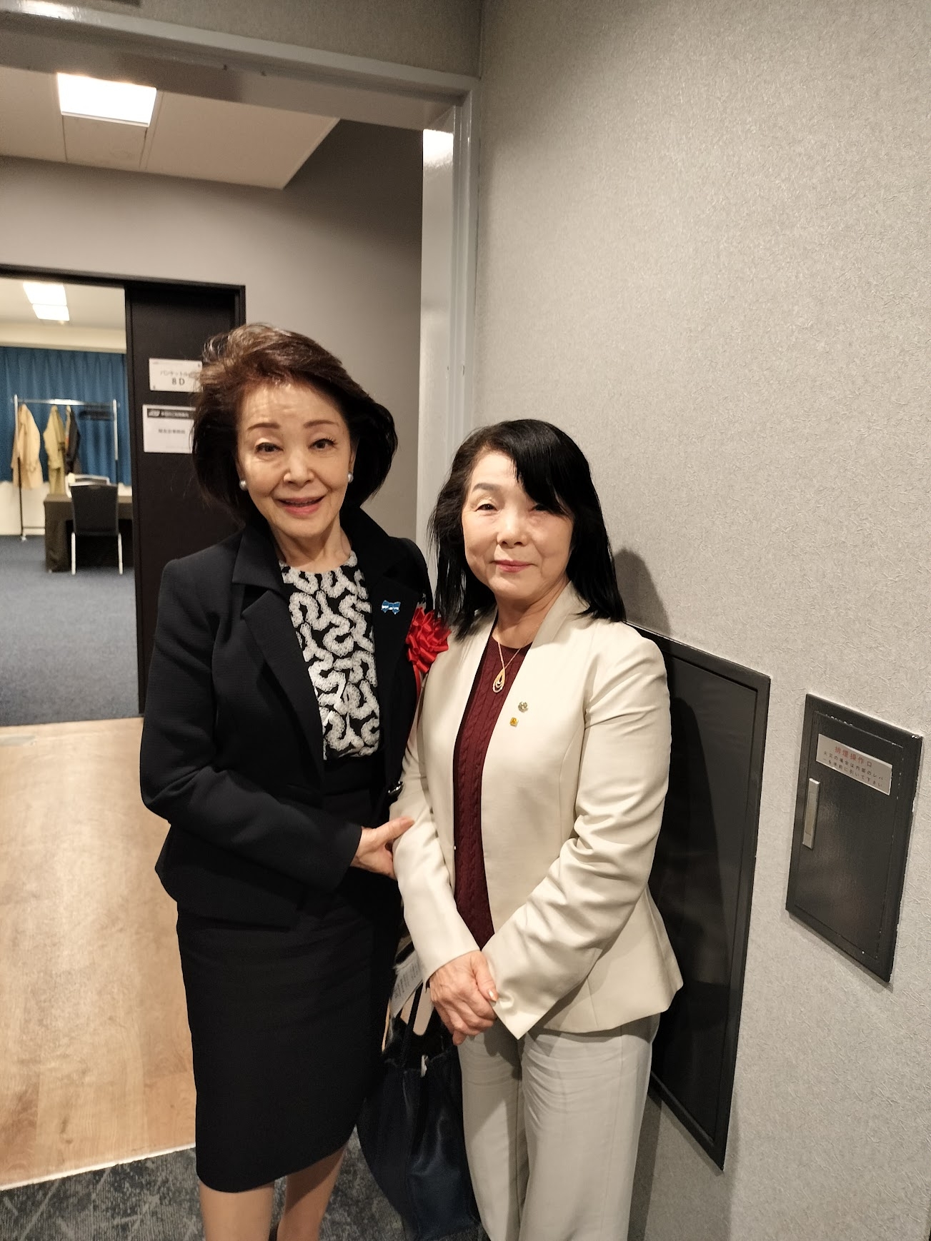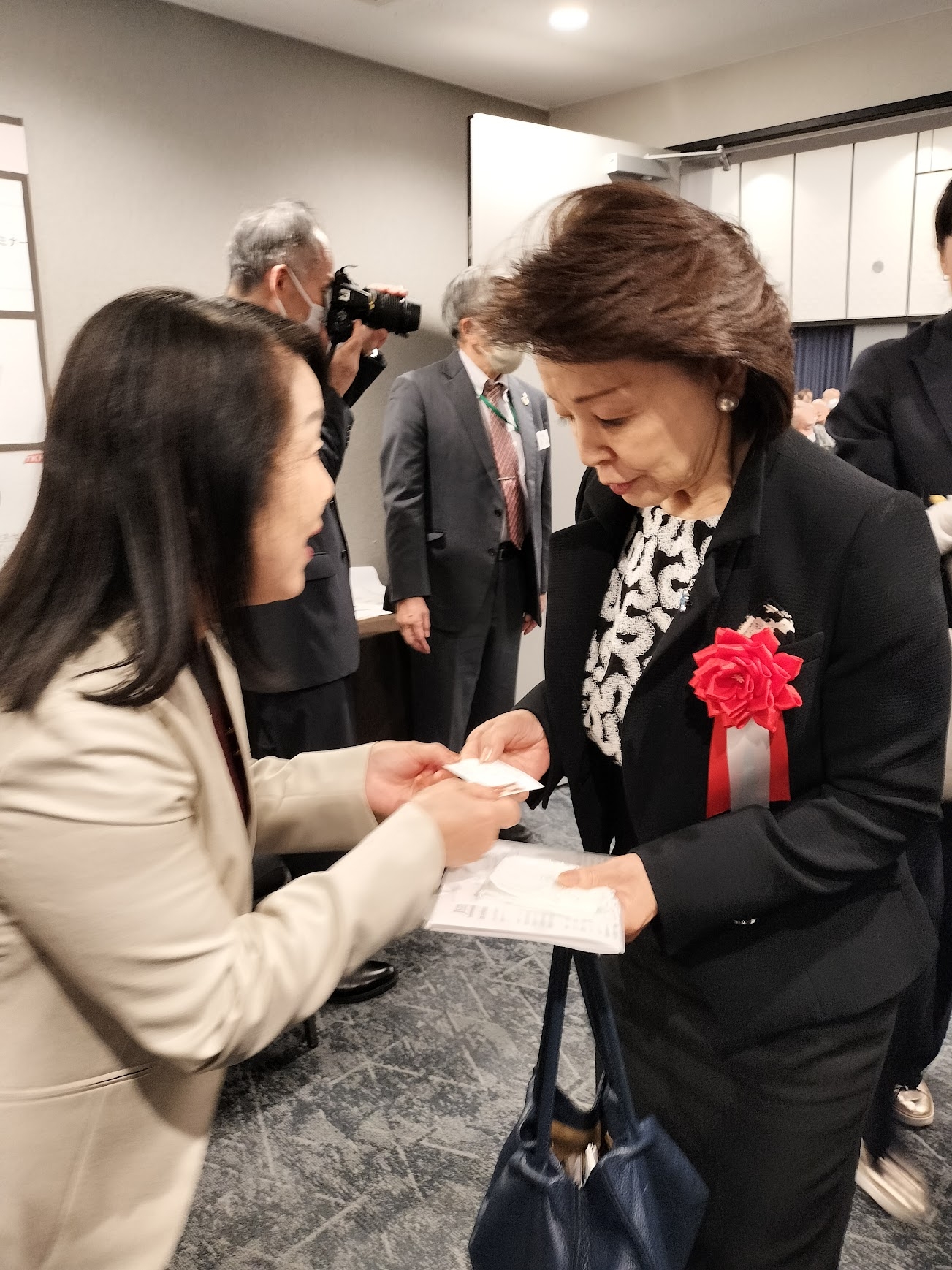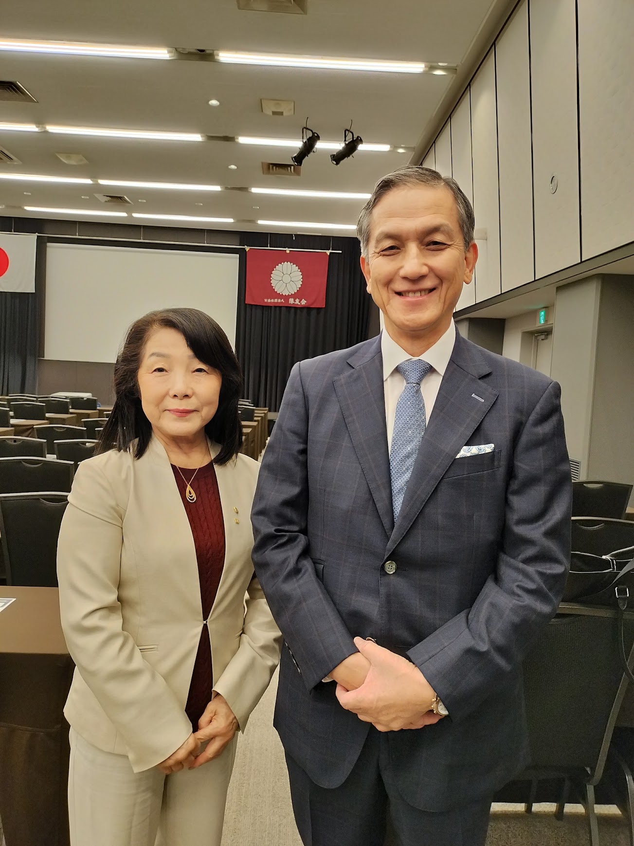 入会説明は、ステージ上に正代県会長、補佐役として小針さん(旗持)のほか大森さん、関根さん、豊島さんの3名が上がりました。会長の説明に合わせてこの3名がパンフレットを表示し、他の会員は2階前列の椅子席にて拍手と祝言「おめでとうございます。」の発声をタイミングよく実施し、場を盛り上げました。