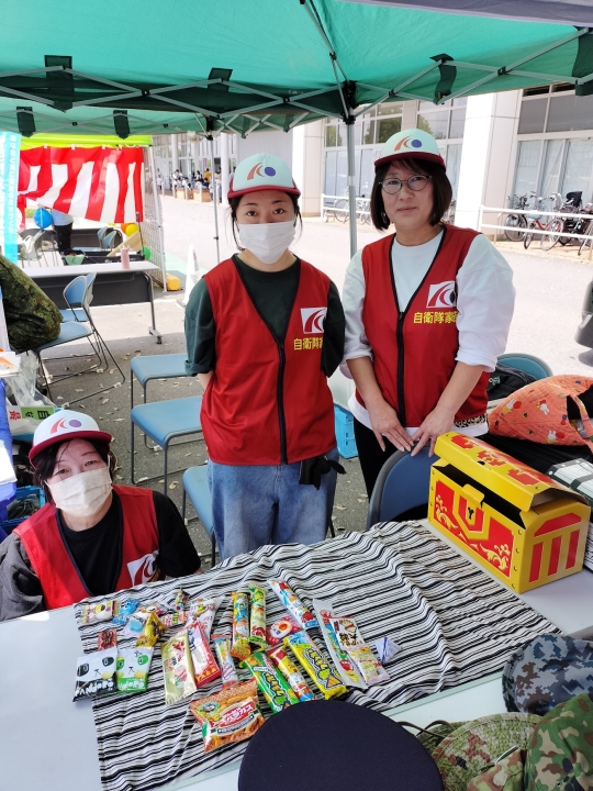 私達家族会は11:00頃から地本龍ケ崎地域事務所(武器学校協力)の皆さんと合流し、ブースの一部をお借りし、宝箱から広げた昔懐かしのお菓子を児童の皆さんにプレゼントしました。児童の皆さんは自衛官の制服及び戦闘服のコスプレをはおり偵察オートバイや高機動車のドライバーに扮して記念撮影で親子で歓声を上げた後、家族会が準備したお菓子を選んでいくのがお決まりのコースでした。