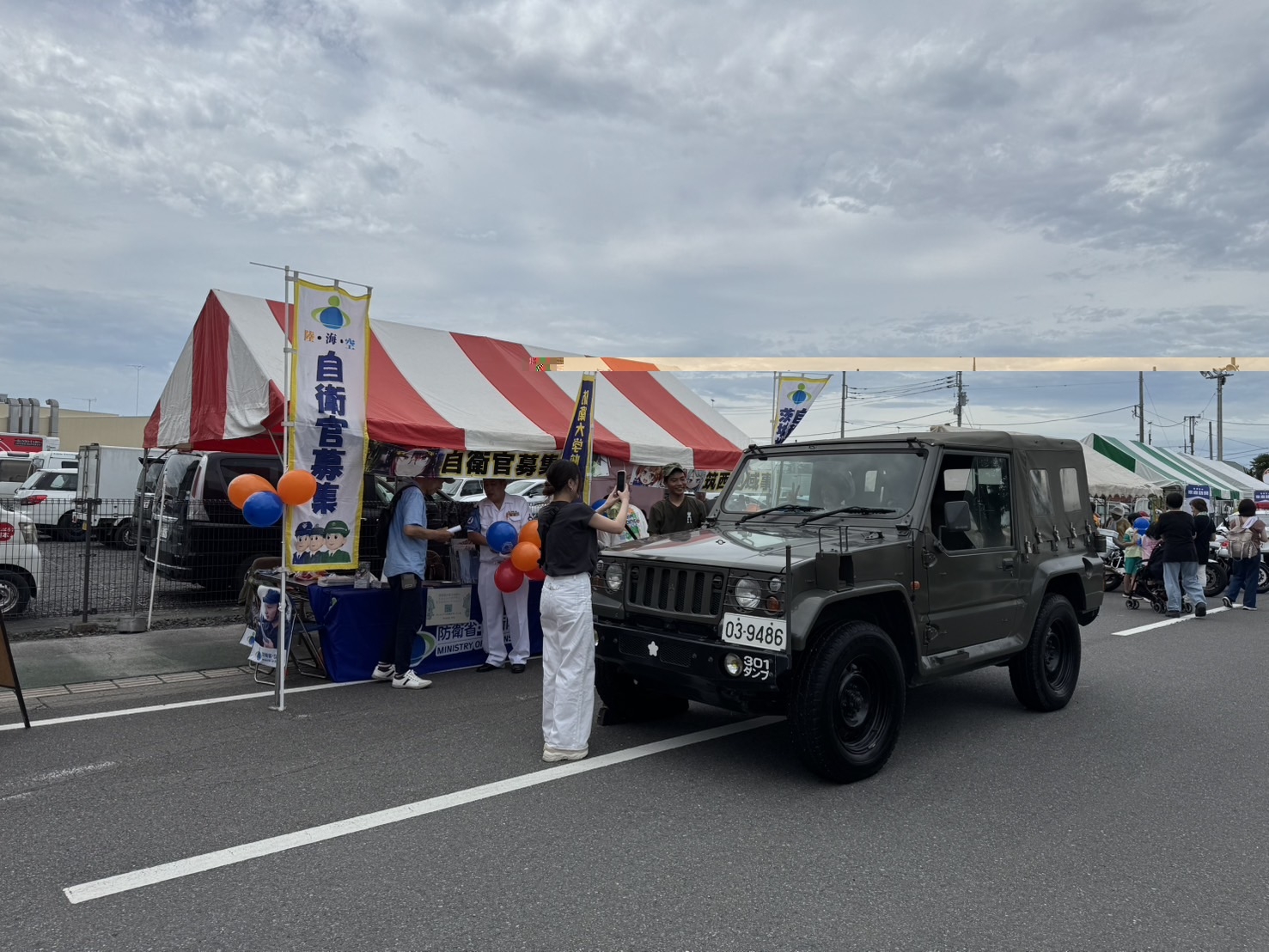 目的は、県自衛隊家族会が重視事業としております自衛隊の募集活動を支援することでした。地本龍ケ崎事務所(武器学校協力)はイオンタウン守谷の東側駐車場にブース(制服・戦闘服の試着(コスプレ)コーナー、高機動車・偵察用オートバイの試乗コーナー、募集案内コーナー)を設置し、活動されておりました。県家族会側からは会員の有志5名が参加し、活動を支援いたしました。