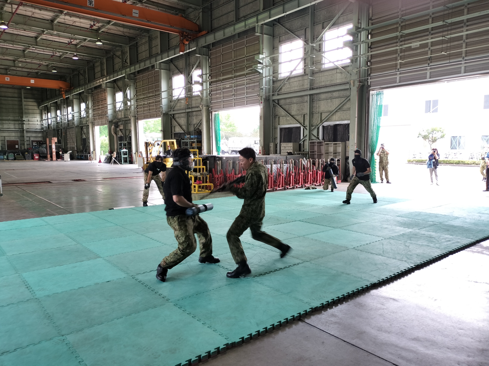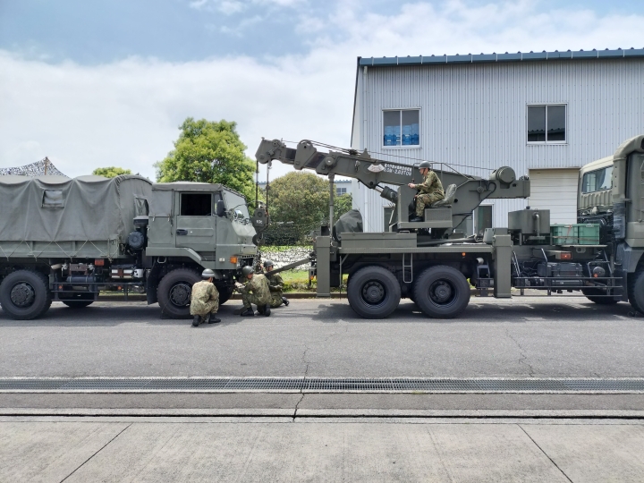県自衛隊家族会から応募者16名が参加し、午前9時ごろ101全般支援隊の整備工場地区に到着、高橋隊長から部隊の任務・編成・運用等の概要説明をいただき、その後、次週から訓練検閲を控えた部隊の済々とした隊容検査、部隊統一の車両点検、小銃射撃手順、重機関銃及びLAM(無反動砲)の操作手順を展示いただきました。その後、部隊指導者による格闘展示、大型トラックの故障を想定した車両回収の展示等多種多様な訓練展示を頂き、101全般支援隊の威容を実感することが出来ました。