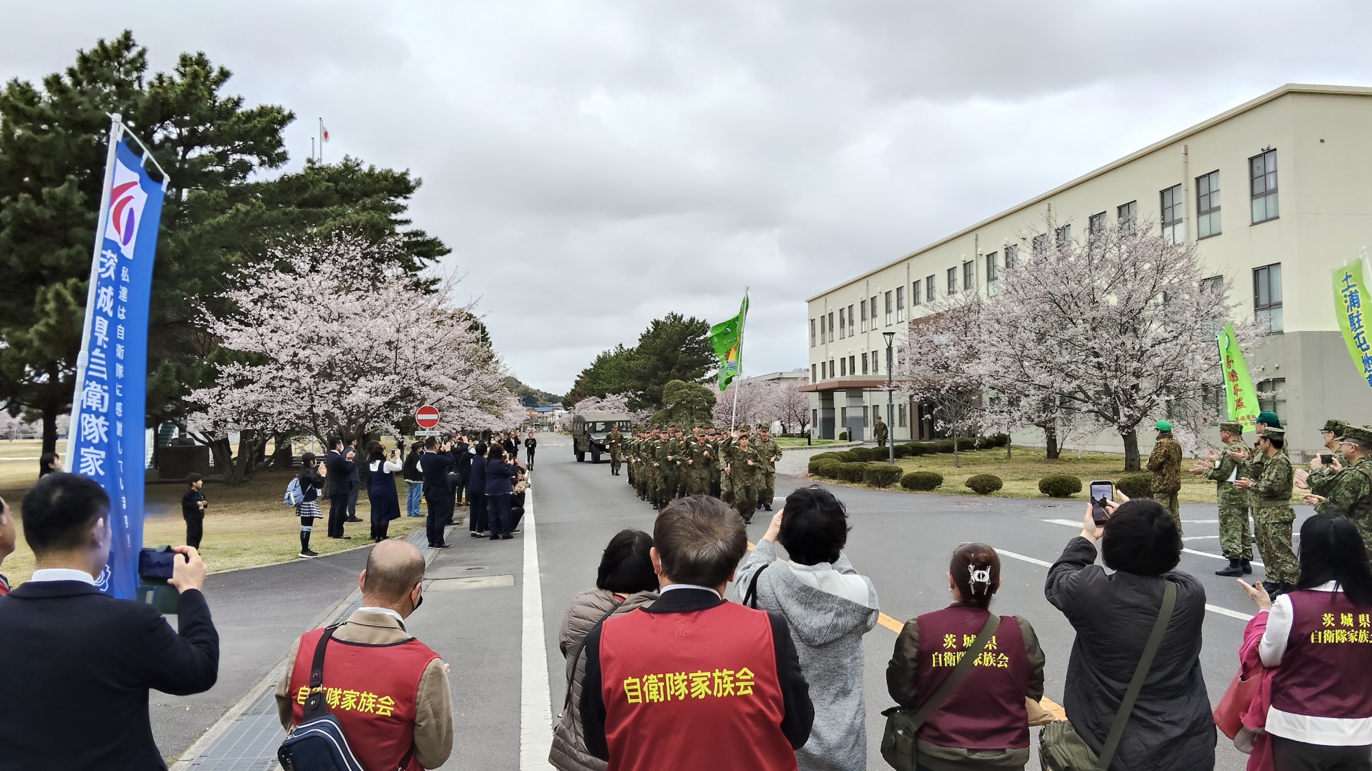 令和8年4月1日(水)に後方支援学校武器科部の生徒課程の皆さん47名が一斉に3等陸曹に昇任する昇任行事が行われ、県自衛隊家族会から正代県会長以下10名(県大森監事、県関根会計、県髙橋監事、かすみがうら市木間塚会長、龍ヶ崎市酒井副会長、石岡市中嶋会員、阿見町武井会員、水戸市鈴木会員、県正代事務局長)が招待され参加いたしました。