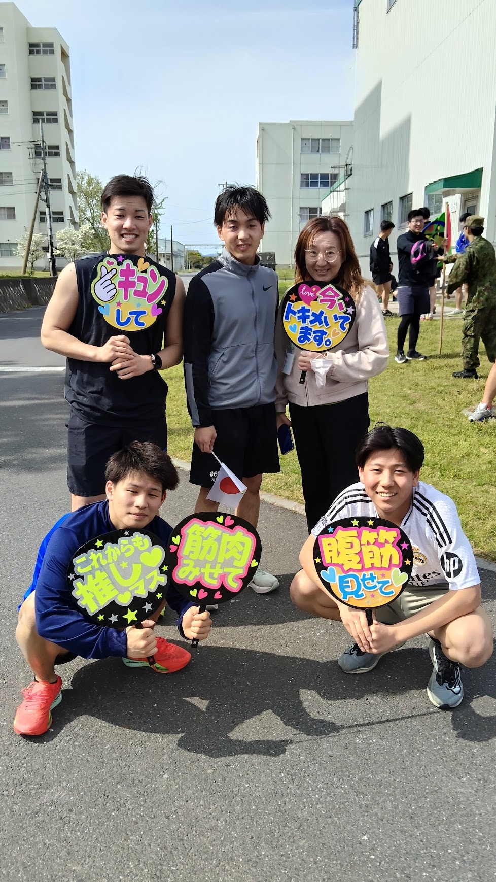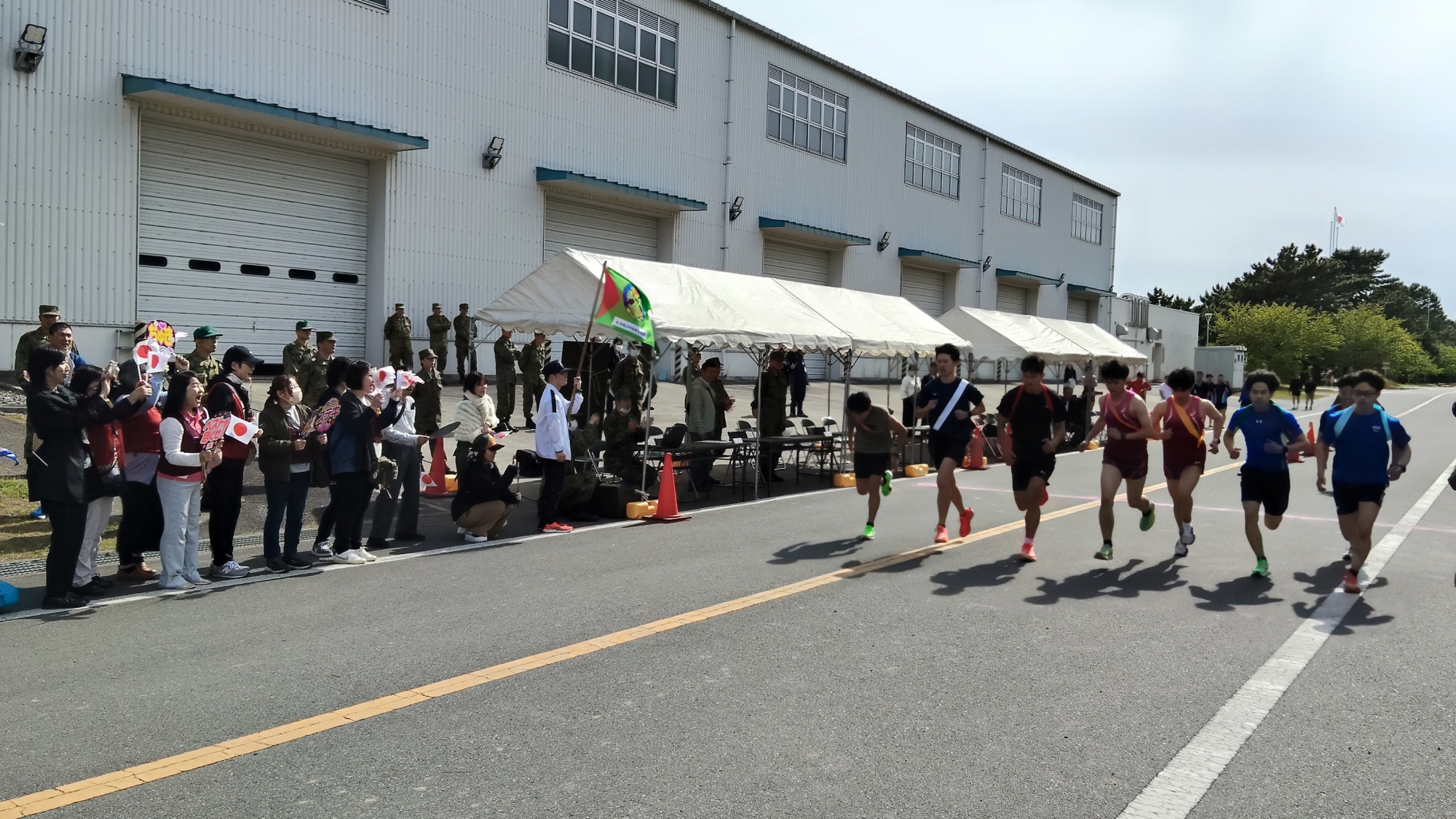 県自衛隊家族会は、武器科・施設科、速い・遅い等の選手に対しても、分け隔てなく最後まで大きな声援を送りました。疾走する生徒諸君は昨年の応援時と同じく、家族会の女性を中心とした声援に奮起し、爽やかな汗と共に最後まで一所懸命駆け抜けていました。